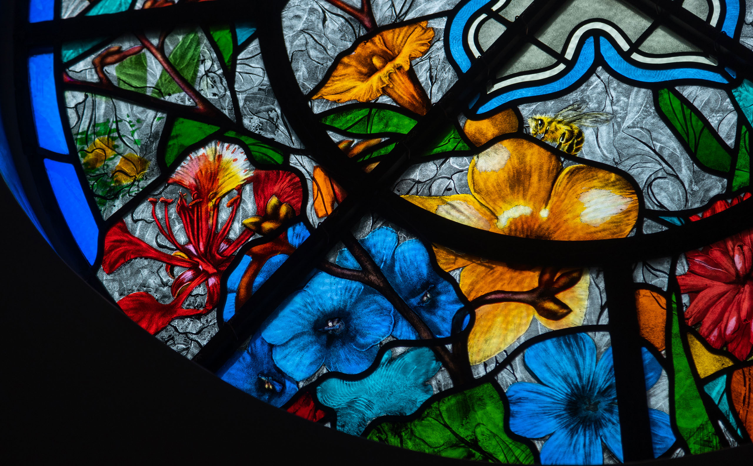 John Reyntiens made his first stained glass window when he was nine years old. He set up his stained glass studio in 1996 in London and since then has worked on everything from small scale domestic stained glass projects to art glass on a large scale in public buildings: Windsor Castle, Westminster Hall, Jesus College, Cambridge, and internationally in hospitals, museums, schools, churches, hotels and office buildings. Clients include Her Majesty the Queen and Versace.