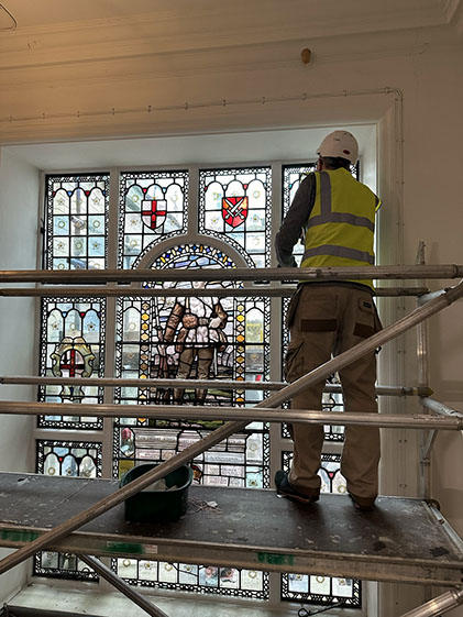 In studio conservation of the two large boardroom windows within the portal trust building. The windows were showing significant signs of warping, so were removed for full re-leading restoration.